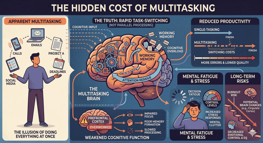 Neuroscience is pretty clear on this: the human brain cannot truly multitask. What it does instead is rapidly switch between tasks — and every switch comes at a cost. Researchers call it “switching cost.” Each time your brain jumps from one task to another, it takes time to reorient, refocus, and reload the context of what you were doing. Studies from the American Psychological Association found that switching tasks can cost as much as 40% of productive time over the course of a day.